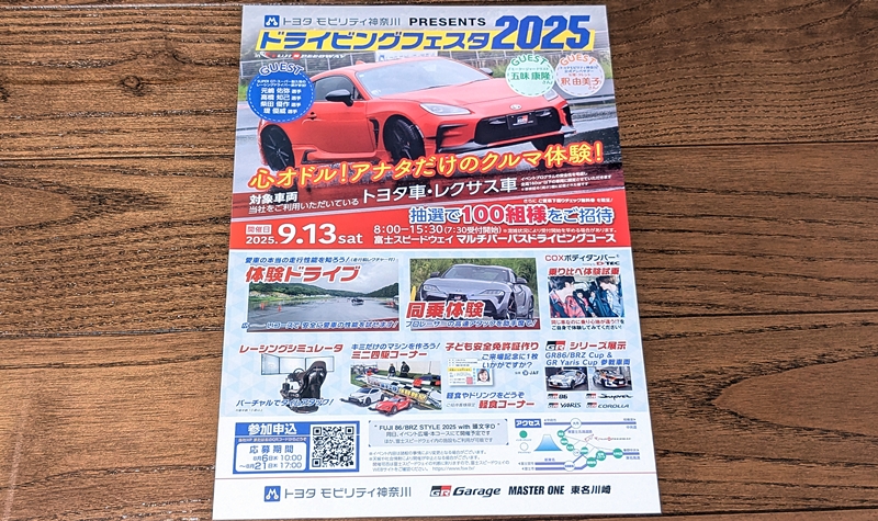 9月13日(土)富士スピードウェイト マルチパーパスドライビングコースで開催される、トヨタ モビリティ神奈川主催の「ドライビングフェスタ2025」への参加申し込みをしたところ、見事当選しました\(^o^)/